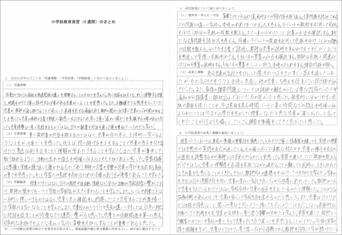 初めての授業では、私が意図した内容と少しずれた発言が多く見られましたが、先生方からのご助言を受け、反省を生かして2回目は発問や板書の書き方を工夫したところ、1回目よりも改善が見られました。発問や板書の大切さ、また学級が変わると授業の雰囲気や発言が異なることを実感しました。改めて、先生方の偉大さと、児童の実態に合わせて授業を考えることの大切さを学びました。