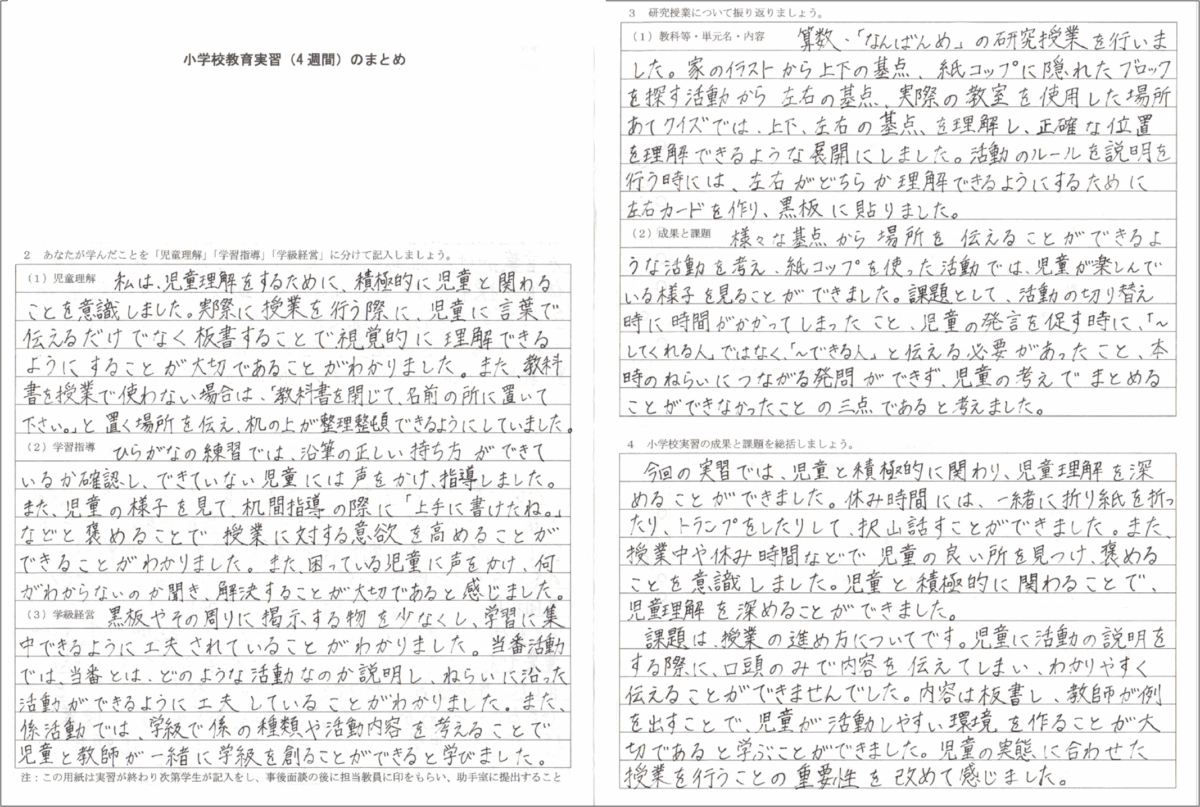 2024年後期から教育実習の事前指導を受け、5月から7月にかけて教育実習にいきました。4週間の教育実習の中で、多くの授業実践を経験させていただくことができました。校長先生や実習担当の先生の講話、配属学級以外の学年の授業参観、学校行事への参加、校外学習、授業実践、振り返り等を通して、小学校現場でしかできない多くのことを経験し学びを深めることができました。