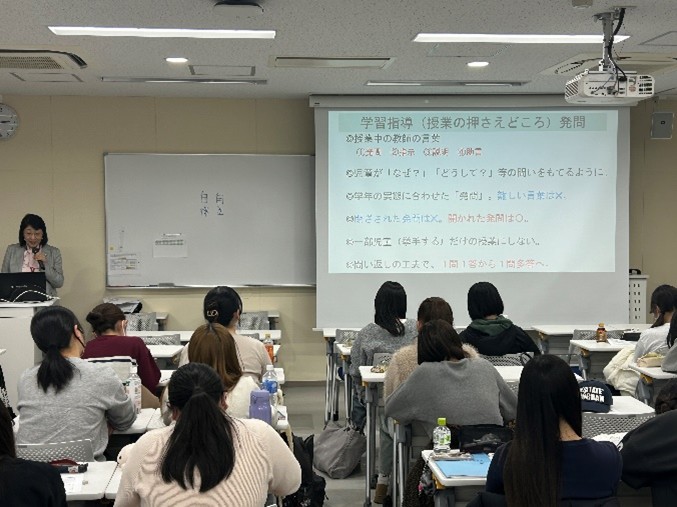 講話では、教師に求められる資質や能力をはじめ、現在の学校現場の様子や、今後の教育の方向性など、幅広い内容についてお話しいただきました。学生は、学校教育や教育実習の全体像をより具体的にイメージするとともに、授業展開や教師による支援の在り方など、細かな点にも目を向けることができたようでした。